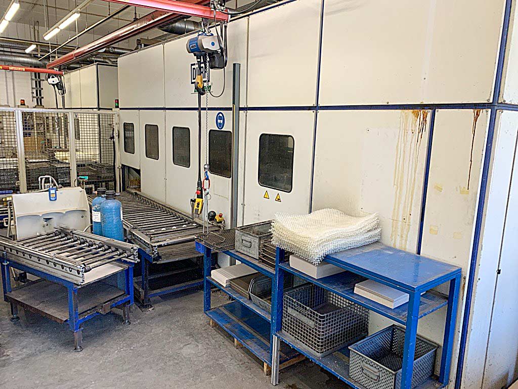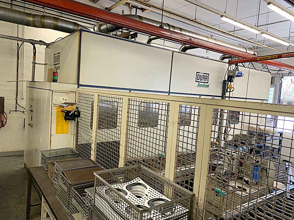 An industrial inline cleaning system Dürr with a retrofit from 2013 is available. Batch dimensions X/Y/Z: 670mm/480mm/300mm, max. batch weight: 100kg, throughput capacity: approx. 8batches/h, throughput weight: approx. 800kg/h, max. bath temperature: 70°C, max. air temperature: 130°C, stations: 5, machine dimensions X/Y/Z: approx. 6250mm/2450mm/3000mm, control system: Siemens Simatic S7. The temperature control of the system is defective. Including a Geltz ion exchanger circulation system. Documentation available. An on-site inspection is possible.