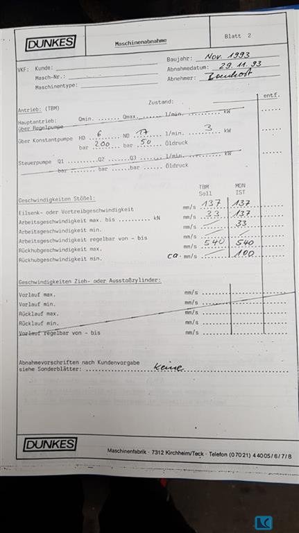 pressure: 10 t throat: 0 mm stroke: 400 mm total power requirement: 7,5 kW weight of the machine ca.: 6500 t dimensions of the machine ca.: m D U N K E S (Germany) CNC Controlled Hydraulic Double Column Press Model HD 10 Year 1993 ________________________________________________________ Pressure 10 tons Ram stroke 400 mm Mounting height 600 mm Table size 400 x 300 mm Table height above floor 820 mm Ram area 400 x 300 mm Ram bore 40 mm Quickspeed, downwards, max. 70 mm/s Working speed, downwards, using max. pressure 40 mm/s Working speed, min. 5 mm/s Working speed adjustable from 5 - 70 mm/s Return stroke speed, min./max. 20 / 175 mm/s Drive 7.5 kW Total electrical load, approx. 12 kW - 380 V - 50 Hz Weigh ...