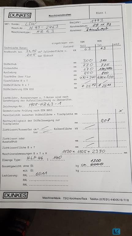 Pressure:63 t distance between columns:1000 mm stroke:300 mm Distance table/ram, max. stroke up, adjustment up:850 mm table surface area:980 x 500 mm table height above floor:850 mm ram surface:130 mm speed down:400 mm/s speed up:461 mm/s working speed:14 - 97 mm/s power requirement:15,0 kW Weight:5,0 t Dimensions (WxDxH):2,0 x 1,6 x 3,9 m depth stop:mechanical foundation pit:not necessary