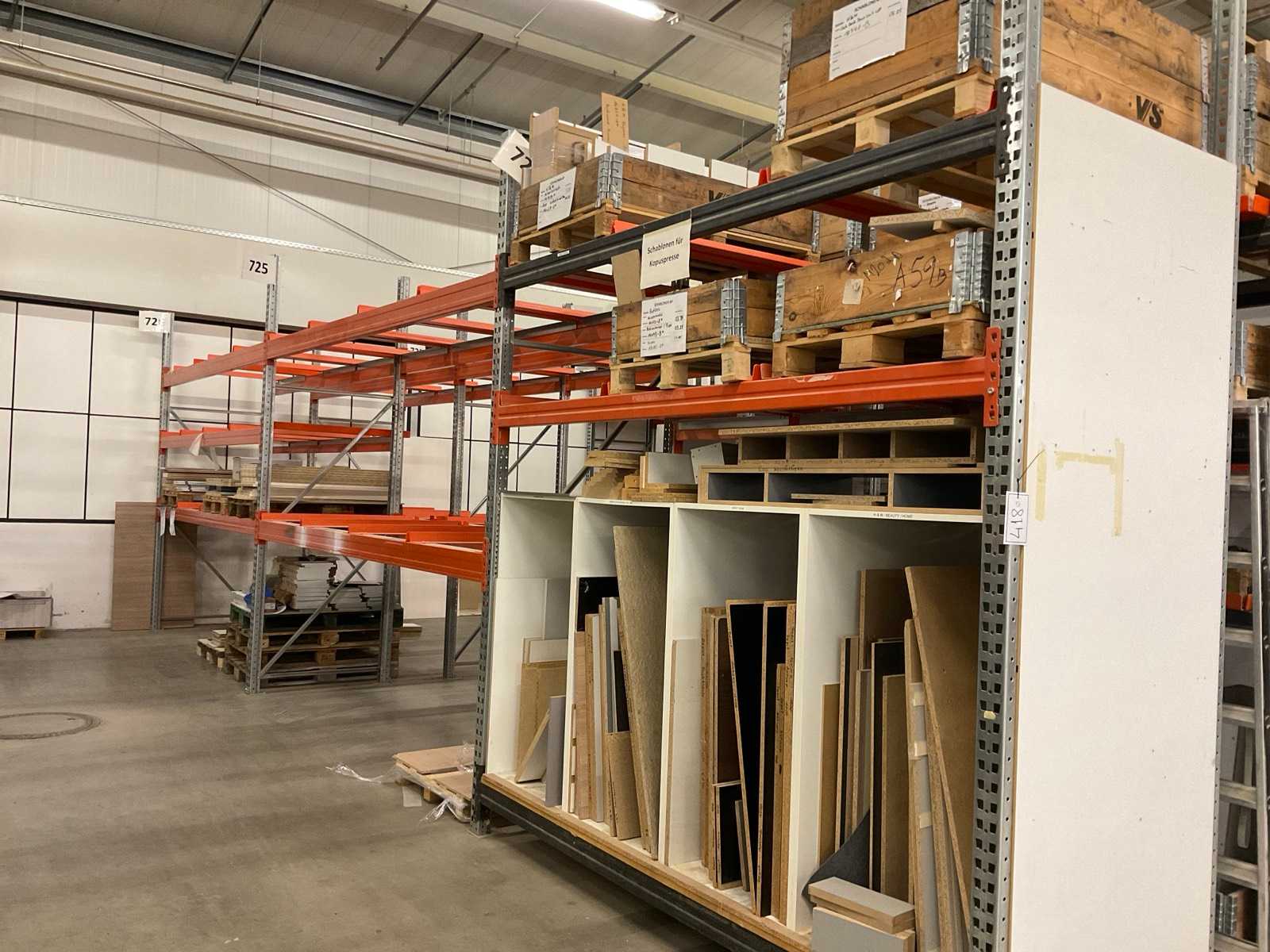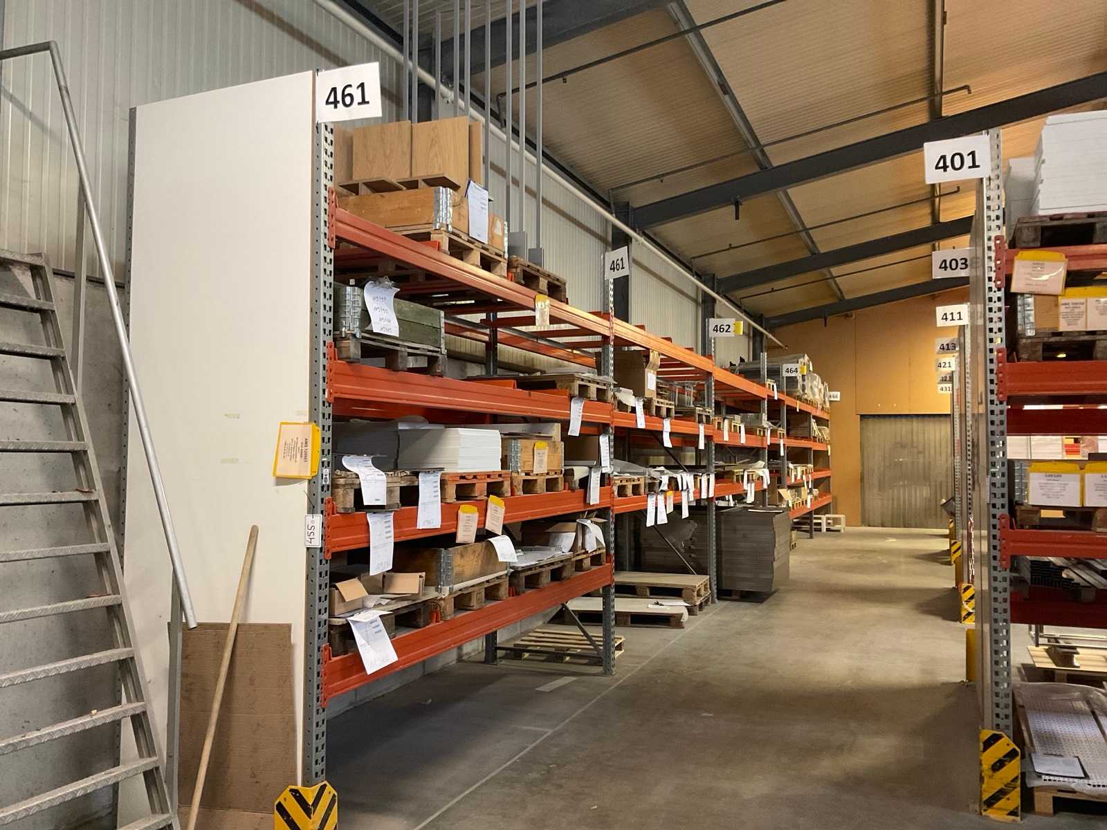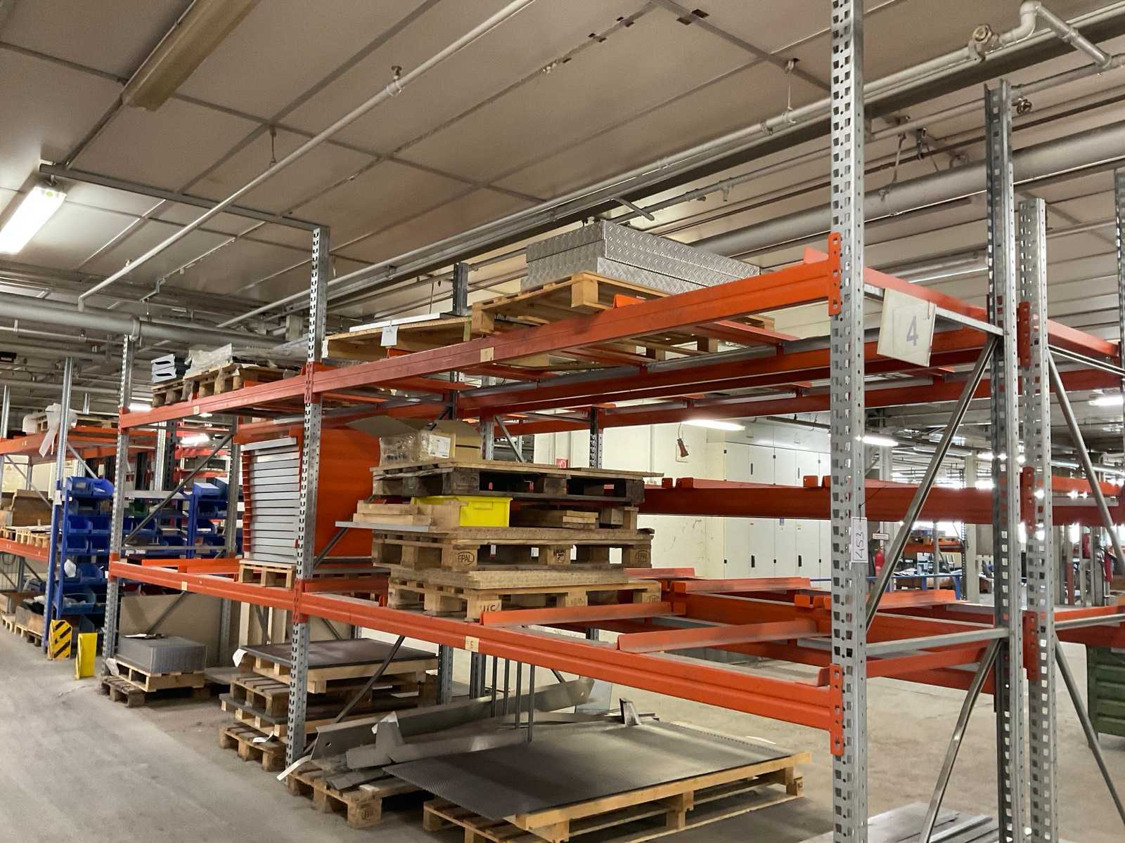 Étagères robustes composées de : 4 montants d’environ 1100x3300 mm, 8 fermes d’environ 3600 mm, 6 fermes d’environ 2 700 mm, y compris les supports à palettes, avec leur contenu Auction-ID: A7-45254-419