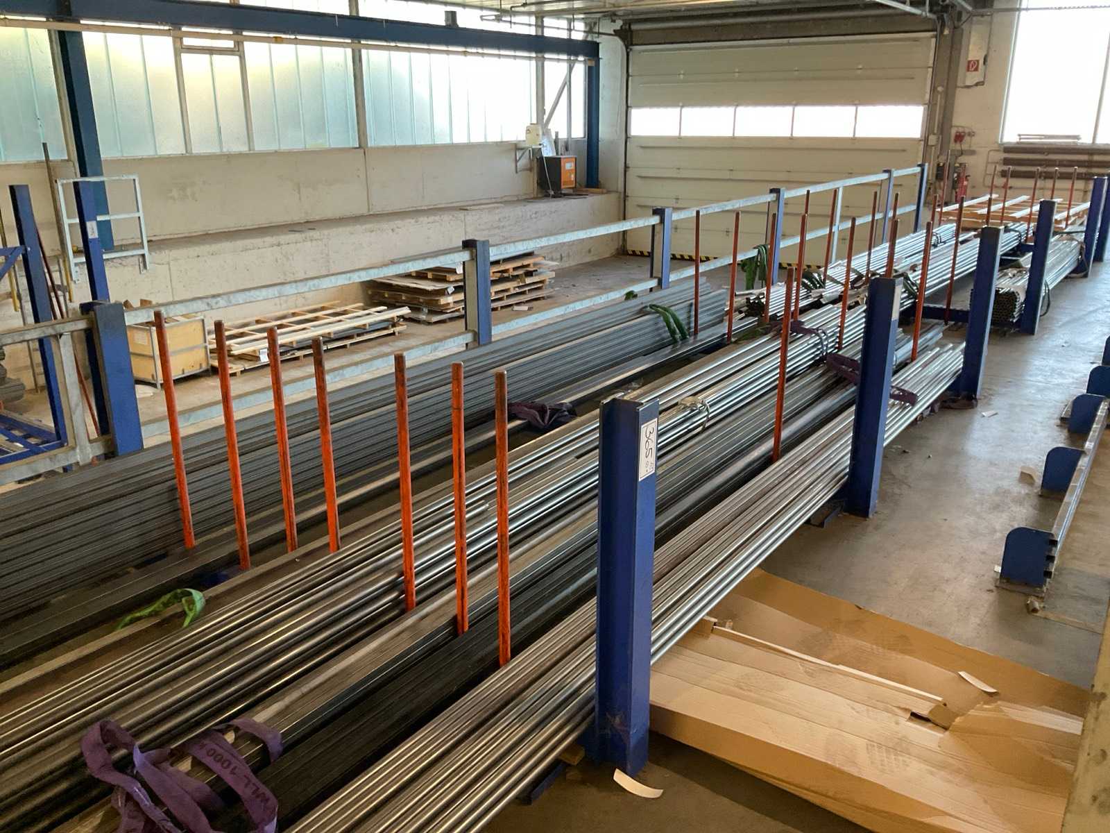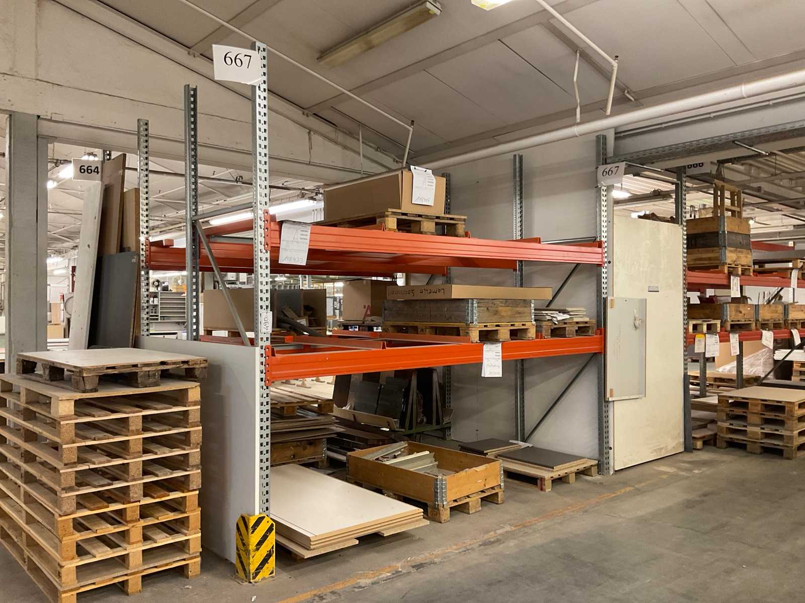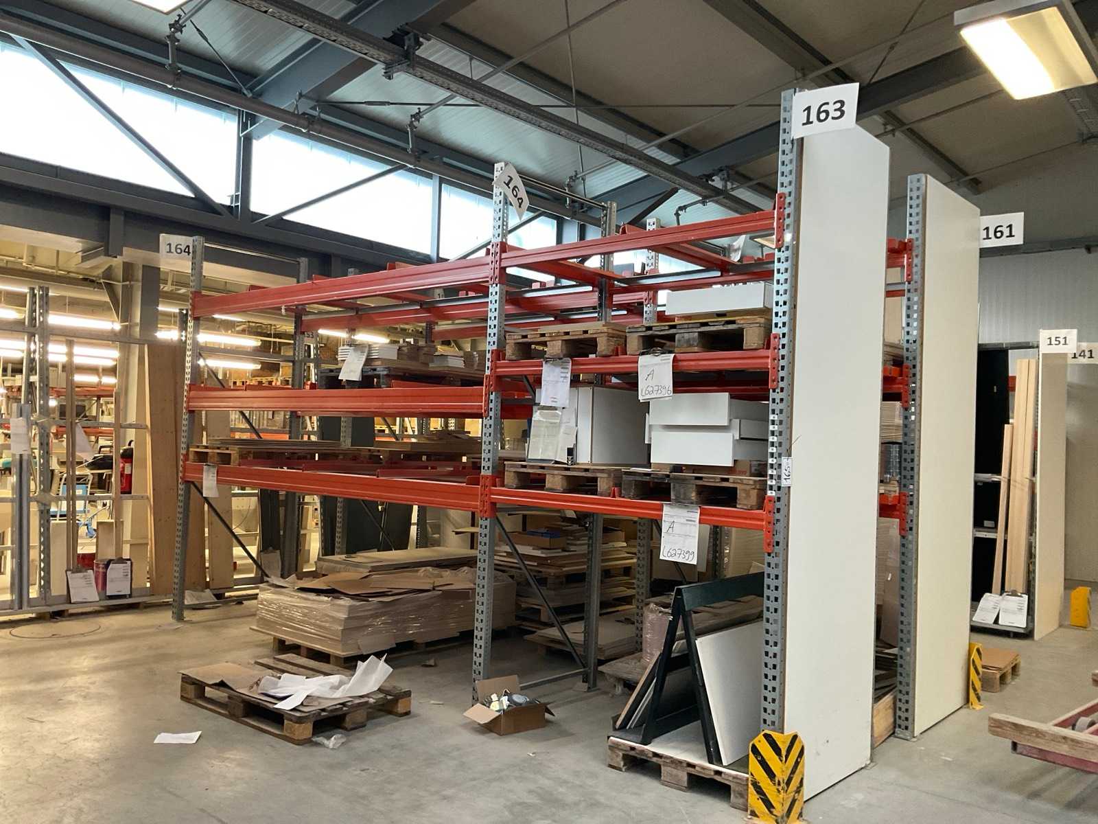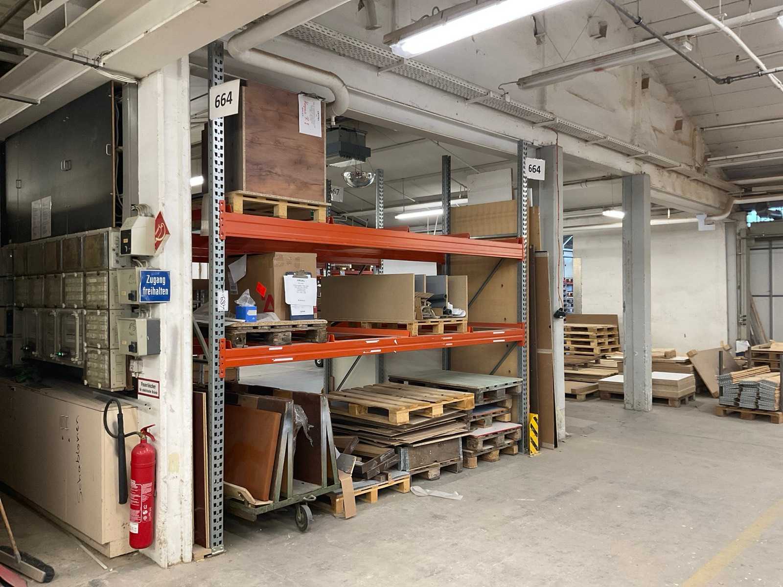 Étagères robustes composées de : 4 montants d’environ 1100x3300 mm, 8 fermes d’environ 3600 mm, 6 fermes d’environ 2 700 mm, y compris les supports à palettes, avec leur contenu Auction-ID: A7-45254-419