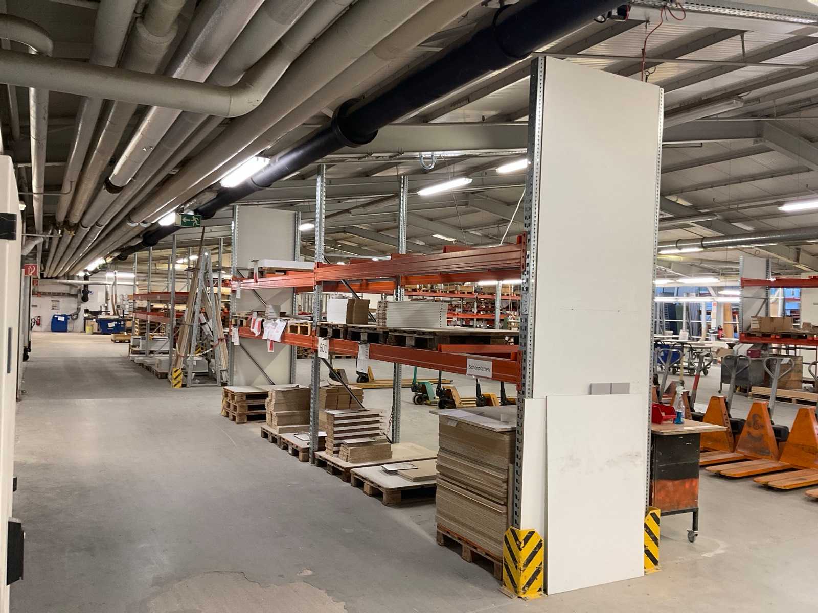 Étagère robuste composée de : 7 montants d’environ 1100x3300 mm, 6 fermes d’environ 1790 mm, 36 fermes d’environ 3 600 mm, y compris les supports à palettes, avec leur contenu Auction-ID: A7-45254-455