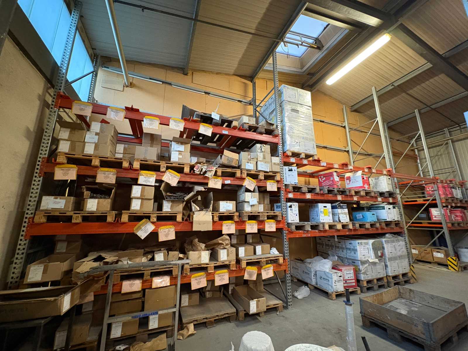 Étagère robuste composée de : 2 supports d’environ 1100x3300 mm, 6 fermes d’environ 3600 mm, y compris les supports à palettes, avec leur contenu Auction-ID: A7-45254-323