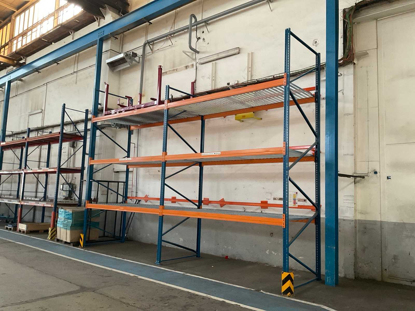 Étagères robustes composées de : 4 montants d’environ 1100x3300 mm, 10 fermes d’environ 3600 mm, 6 fermes d’environ 2 700 mm, y compris les supports à palettes, avec leur contenu Auction-ID: A7-45254-418