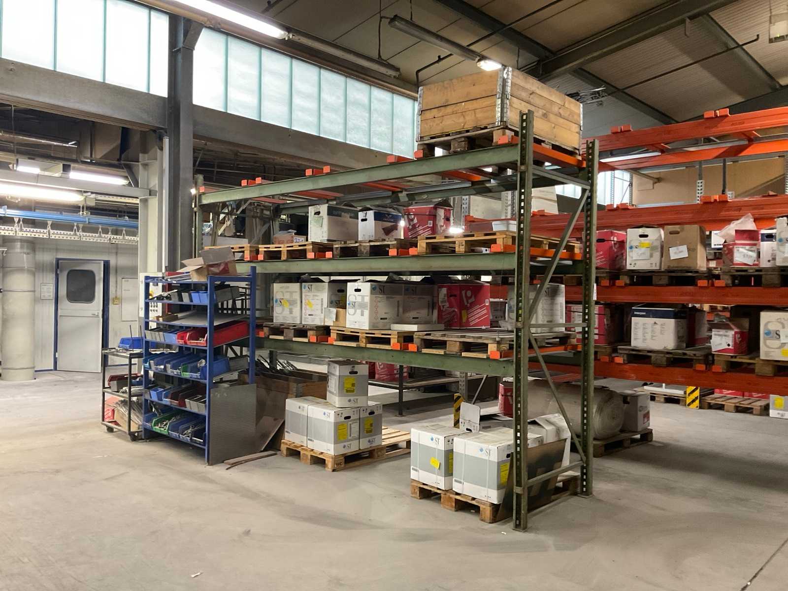 Étagère robuste composée de : 3 montants d’environ 1100x3300 mm, 12 fermes d’environ 3 600 mm, y compris les supports à palettes, avec leur contenu Auction-ID: A7-45254-398