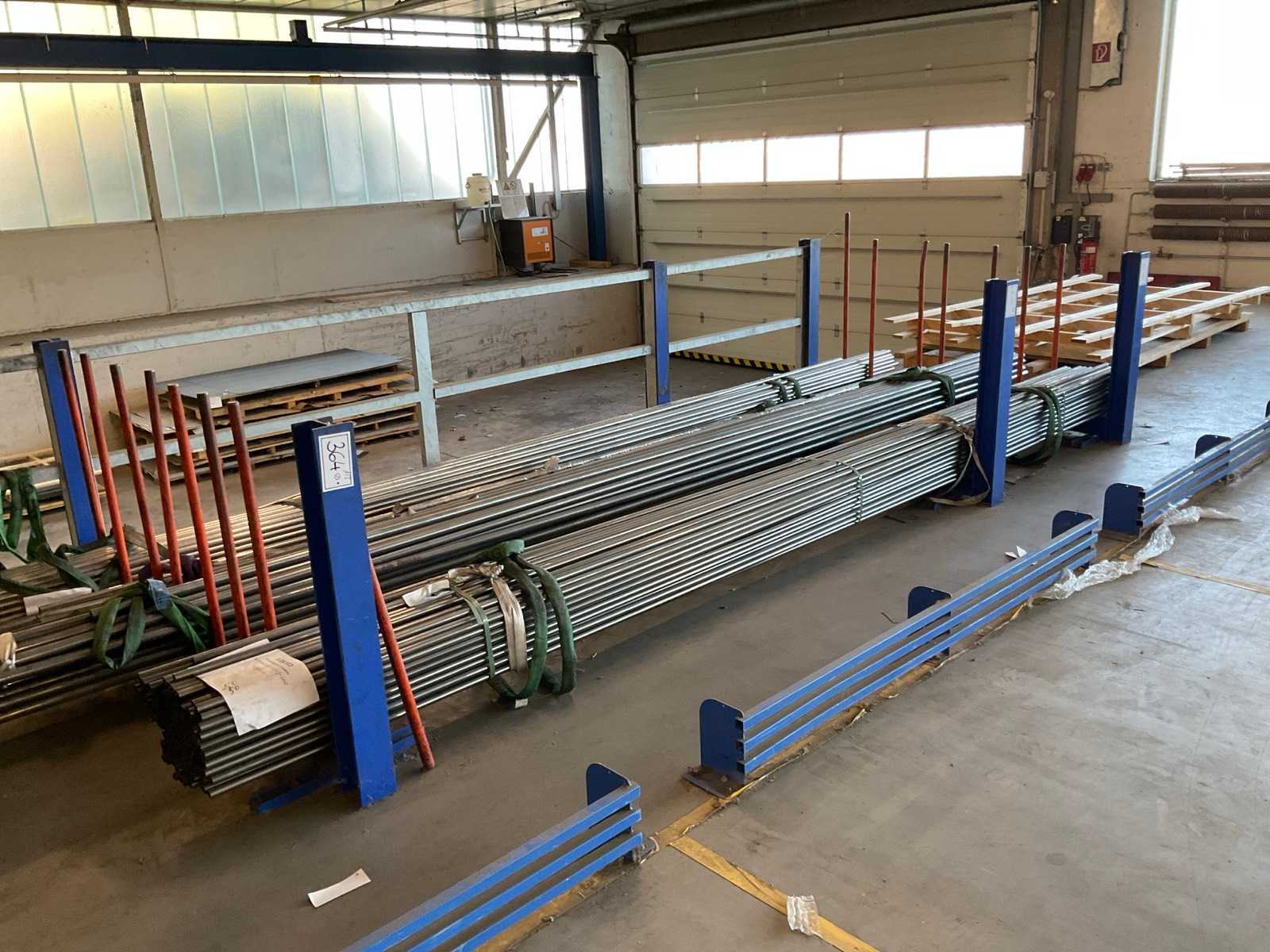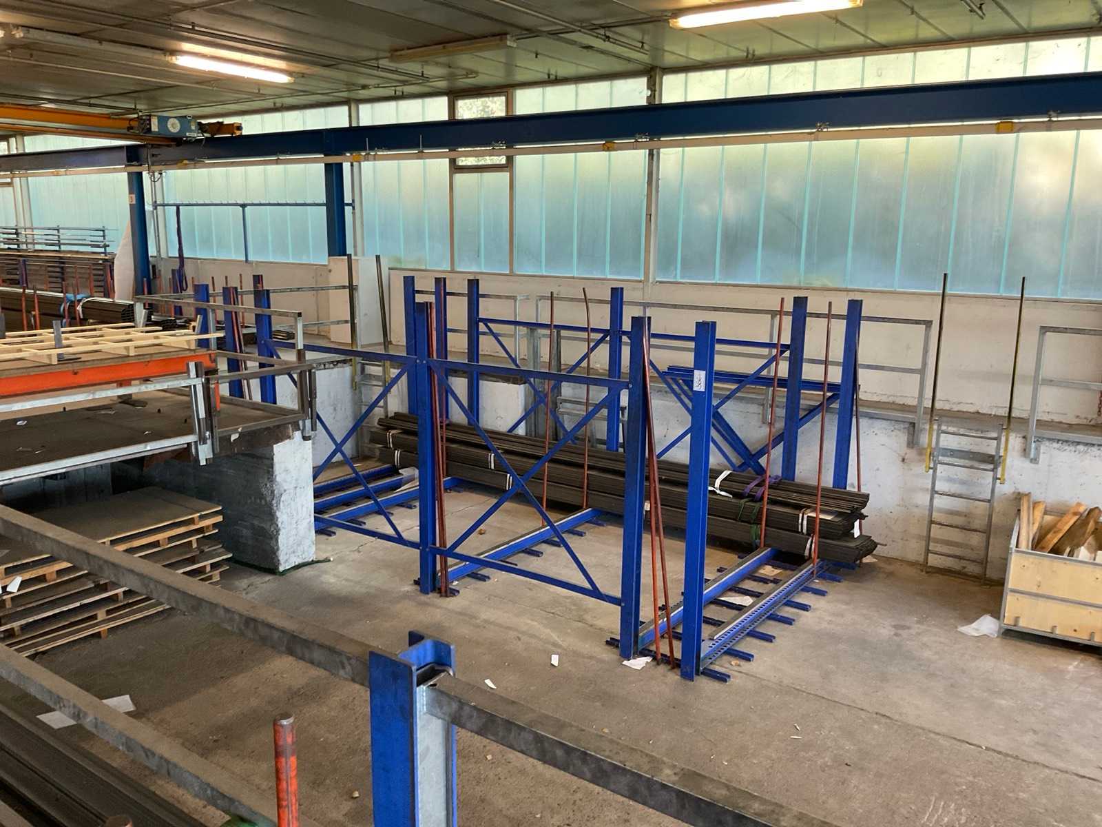 Étagère robuste composée de : 2 supports d’environ 1100x3300 mm, 8 fermes d’environ 3 600 mm, incluant des supports à palettes, avec leur contenu Auction-ID: A7-45254-500