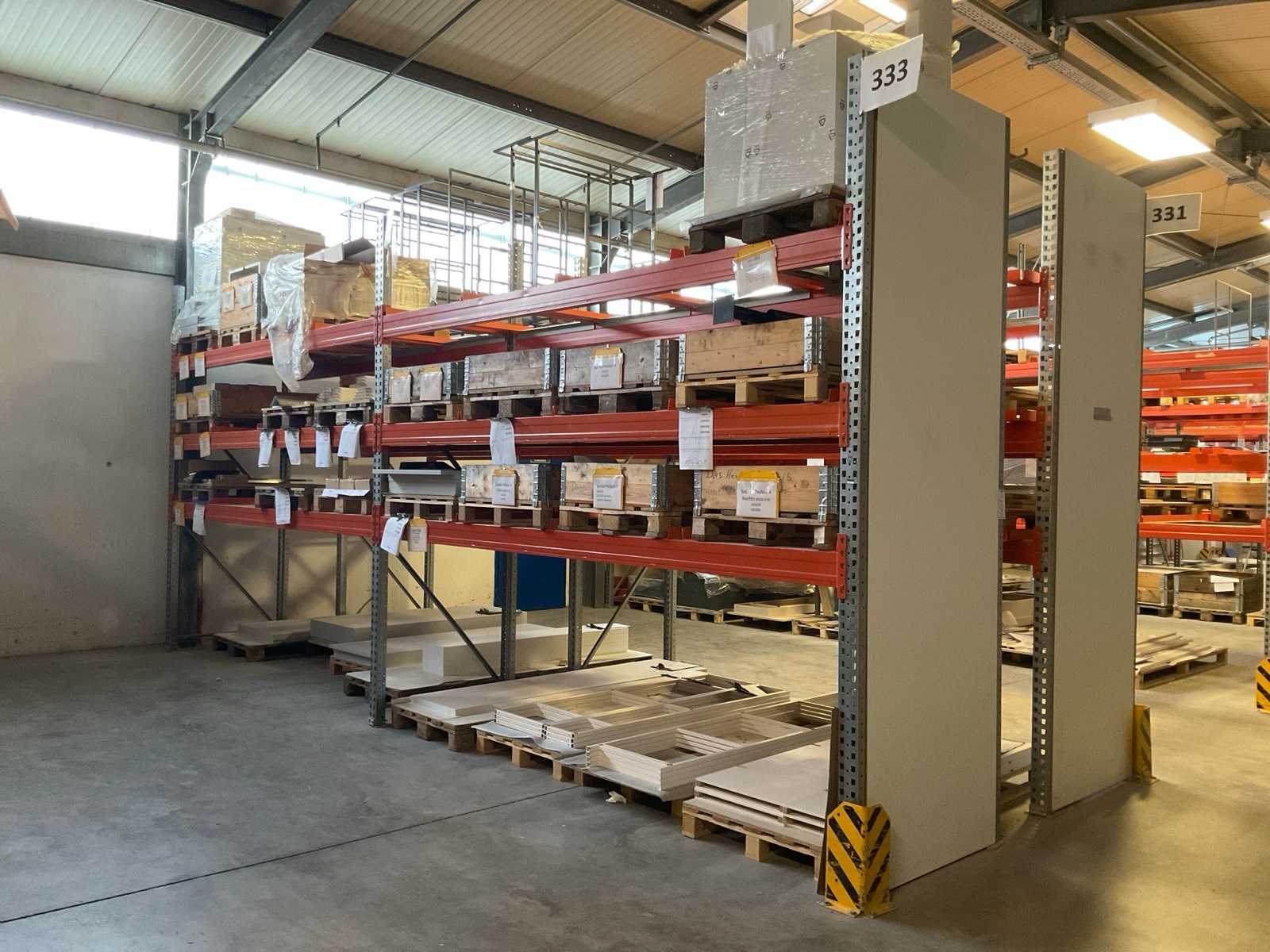 Étagère robuste composée de : 2 montants d’environ 1100x3300 mm, 4 fermes d’environ 3300 mm, avec des supports à palettes, avec le contenu Auction-ID: A7-45254-496