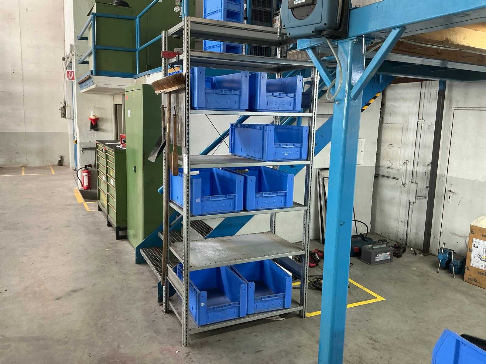 Étagères robustes composées de : 4 montants d’environ 1100x3300 mm, 28 fermes d’environ 3600 mm, y compris les supports à palettes, y compris l’étagère en maille, avec le contenu Auction-ID: A7-45254-351