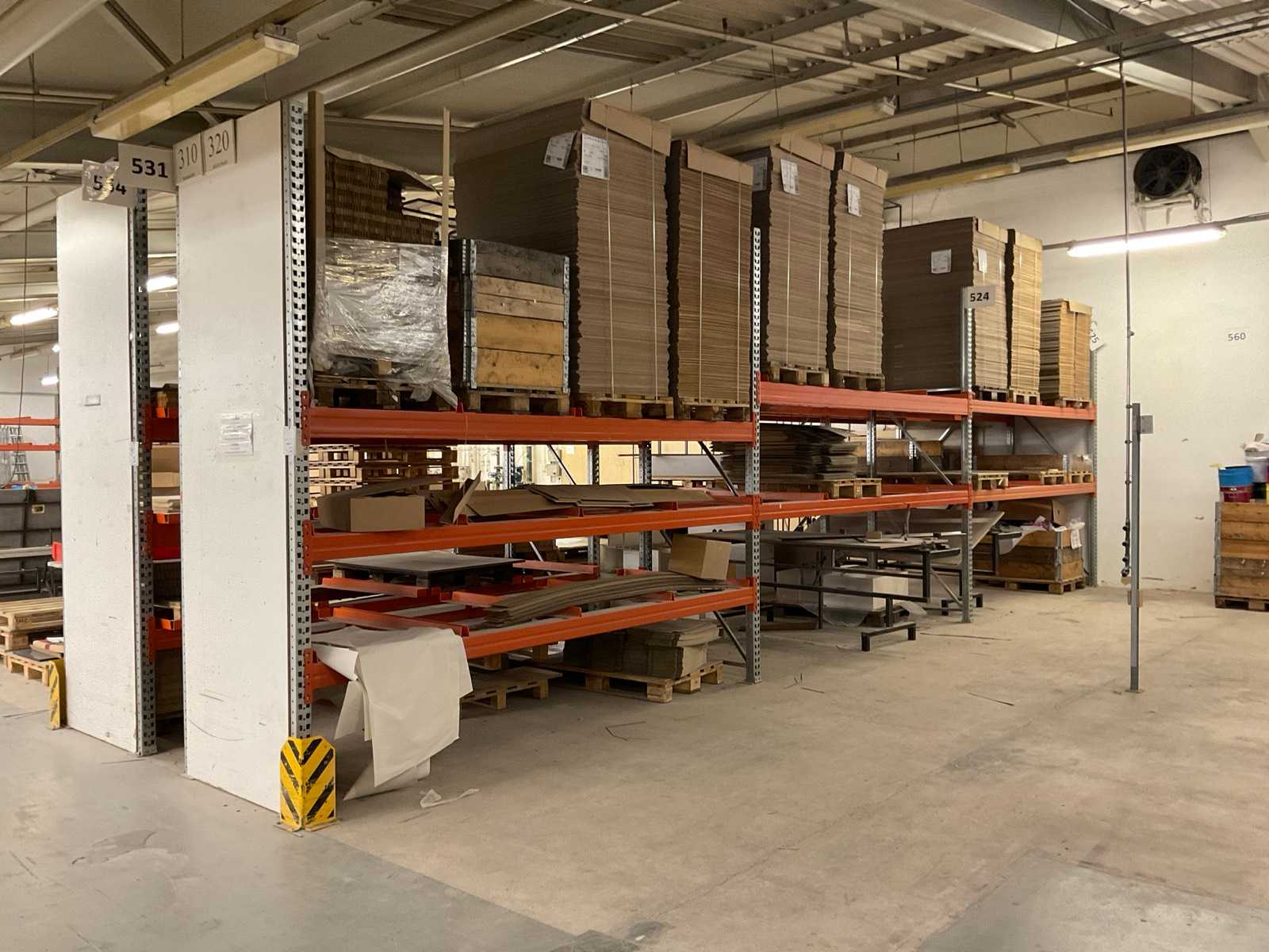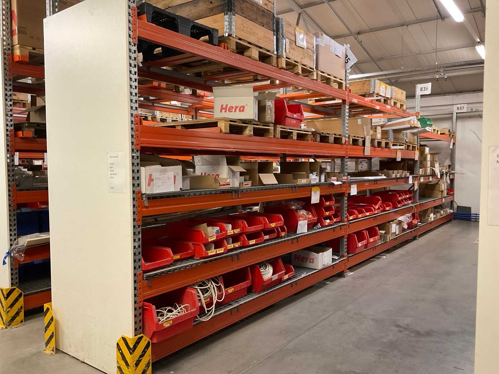 Étagère robuste composée de : 4 montants d’environ 1100x3300mm, 14 fermes d’environ 3600mm, y compris des supports à palettes, avec leur contenu Auction-ID: A7-45254-613