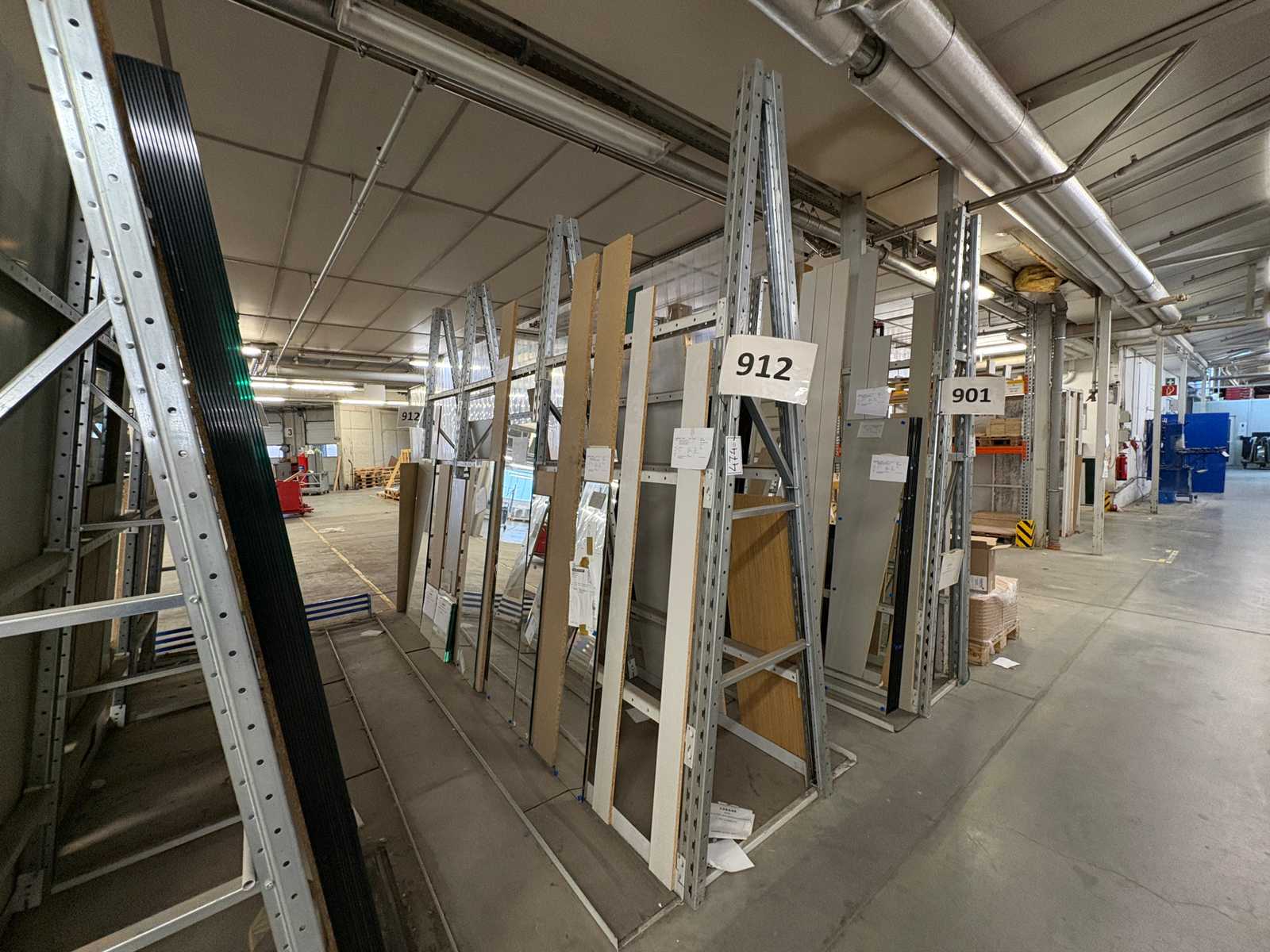 Étagère verticale composée de : 4 supports d’environ 870x2920 mm, angle d’environ 6 degrés, 12 fermes d’environ 1340 mm, 6 fermes d’environ 835 mm, 4 compartiments de soutien d’environ 275x1430 mm, 2 compartiments de soutien d’environ 275x935 mm, avec le contenu Auction-ID: A7-45254-471