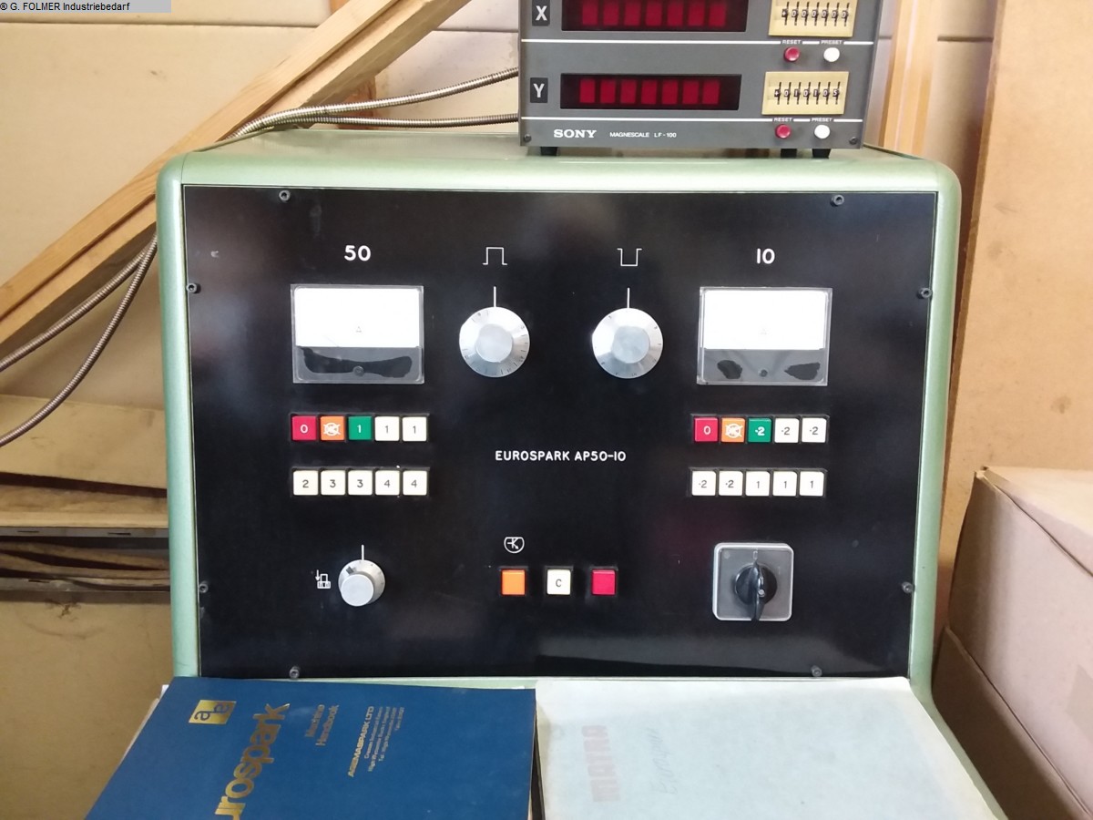 CONTROLS  CNC controls WORKING RANGE -CUBIC-  X-axis travel: 250 mm  Y-axis travel: 160 mm  Z-axis travel: 250 mmTECHNICAL SPECIFICATION  Table-size       ;   : 480 mm  Table-size       &nbs p; : 330 mm  Adjustment of  x-axis: 250 mm  Adjustment of  y-axis: 160 mmELECTRICAL SPECIFICATIONS  mains voltage: 400 V  mains frequency: 50 HzDIMENSIONS / WEIGHTS  space requirements -left/right-: 1200 mm  space requirements -front/back-: 1200 mm  total height: 2500 mm  total weight approx.: 1000 kgEquipment:-Agietron Compact 1 30A/C-axis / DAI 1-P-AGIE Fuzzytron-14" color screen-Fire extinguishing system-3-compartment electrode magazine-Micro-machining  ...