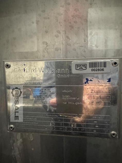 Réservoir de sucre de 15 000 litres/réservoir de stockage Caractéristiques: volume 15000 L Longueur totale 4300 mm Longueur du cylindre 3350 mm Hauteur totale 3600 mm Diamètre 2500 mm matériau V2A (AISI 304) 1.4301 Surface extérieure marbrée Surface à l’intérieur du sol 2B = IIIC Design Horizontal Nombre de pieds 6 Description MJ UNI-HIGH Couronne de réservoir : Afflux 2 champignons 2 x Cathédrale Mesure de niveau numérique Pente du sol 3 % Devant: Fond conique Trou d’homme 420 x 360 mm avec dispositif de sécurité magnétique 2 x connexions de ligne - CIP avant et arrière Purgeur résiduel avec vanne papillon DN 100 Sous: 6 pieds trompette avec coupoles - hauteur réglable sur supports en acier