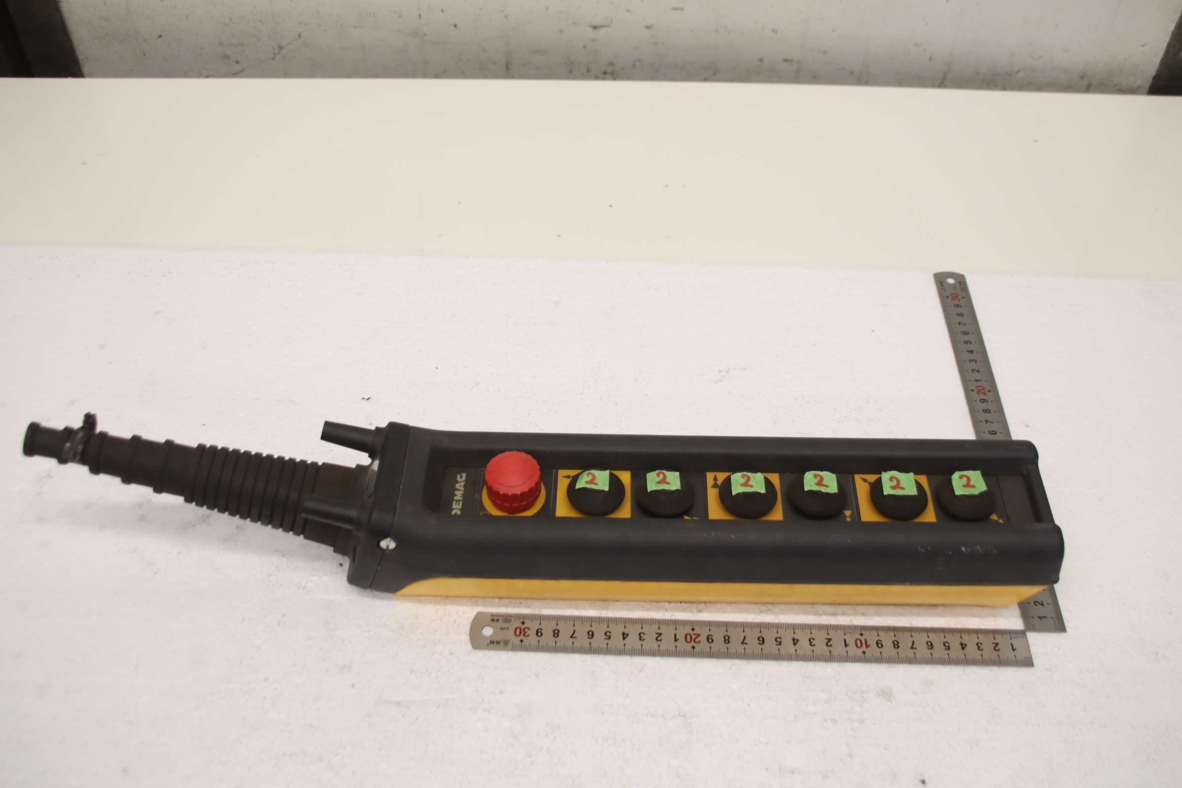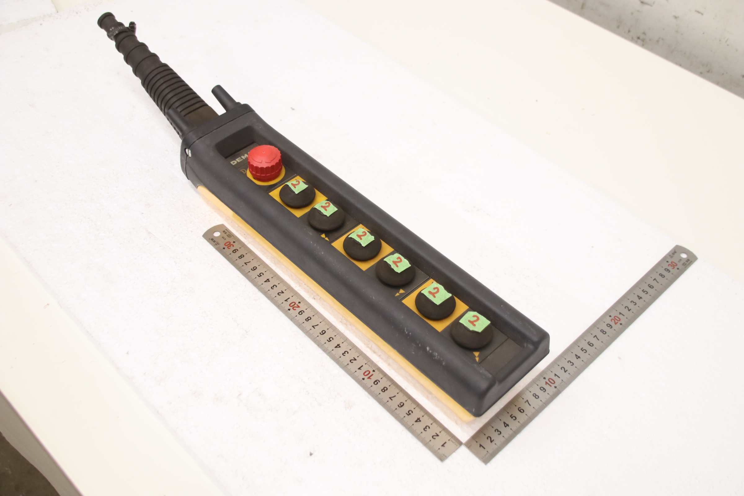 Crane remote control, crane control, crane control, pendant control, control switch, control cylinder -Manufacturer: Demag, control switch for crane remote control -Type: DST7SP222 BE -Identification number: 874 558 44 -Buttons: 1x emergency stop, 6 buttons 2-stage -Transport dimensions: 590/94/H90 mm -Weight: 2.4 kg