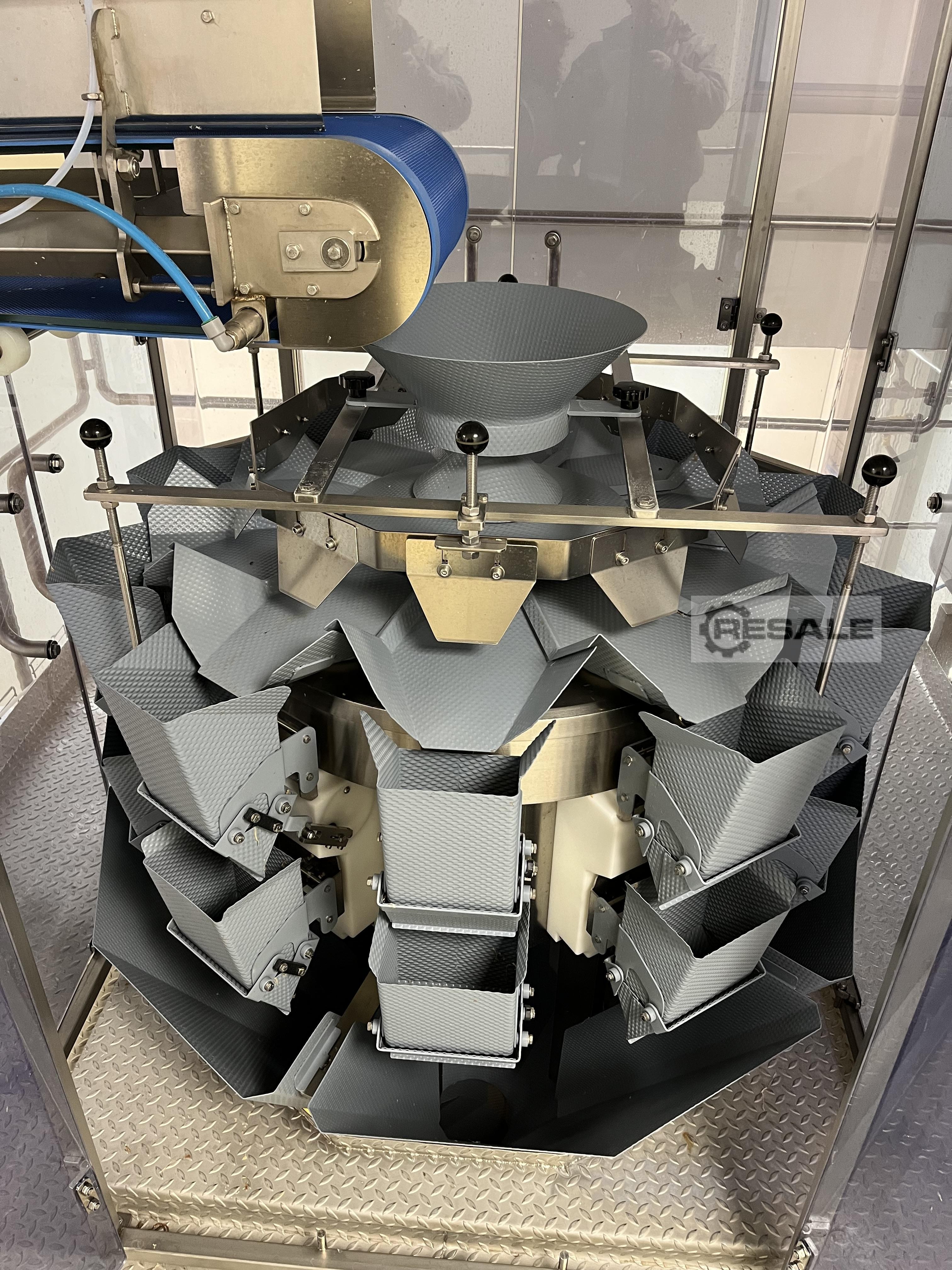 The multihead weigher is also equipped with a discharge system that allows the product to be packed into bags, with the product being released directly from the bottom before being filled into the round containers (this is an alternative option).
