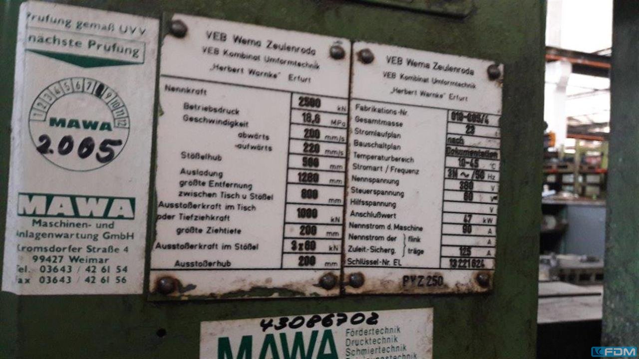 pressure:250 tdistance between columns:1125 mmstroke:250 mmdistance table/ram, max. stroke up, adjustment up:800 mmtable surface area:1100 x 900 mmpressure of drawing cushion in table:63 tstroke of drawing cushion in table:100 mmdie cushion area:700 x 400 mmtable height over floor:960 mmside window:700 mmram surface:1080 x 900 mmoil volume:1000 lpower requirement:35,0 kWweight:23,0 tDimensions (WxDxH):2,5 x 2,3 x 4,5 mGerman Safety: permitted for manual loading:UVV 11.064 - VBG 7n5.2 light guard:Sick foundation pit:not necessary