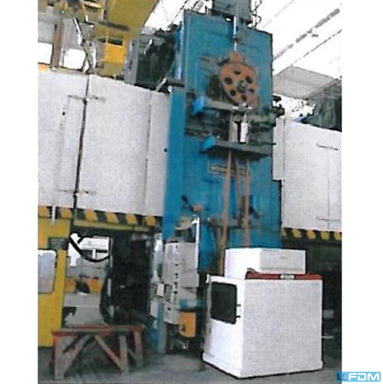 Poids nominal des pièces tombantes : 750 kg Nombre max. de coups par minute : 105 Énergie cinétique : 1900 kg Distance d’un axe du curseur jusqu’au lit : 750 mm Diamètre du cylindre : 600 mm Diamètre du piston : 630 mm Course max. de la poupée : 835 mm Taille: -De gauche à droite : 3940 mm -De l’avant à l’arrière : 1430 mm Hauteur au-dessus du niveau du sol : 3260 mm Poids: -Avec un bloc d’enclume : 25600 kg -Sans bloc d’enclume : 16600 kg