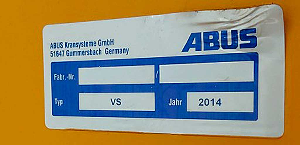 Une grue porte-hall légère ABUS est disponible. Capacité de charge : 1000 kg, dimensions X/Y/Z : 1000 mm/4000 mm/3280 mm. Une inspection sur site est possible.