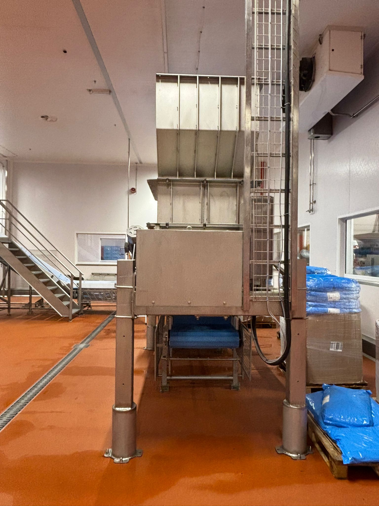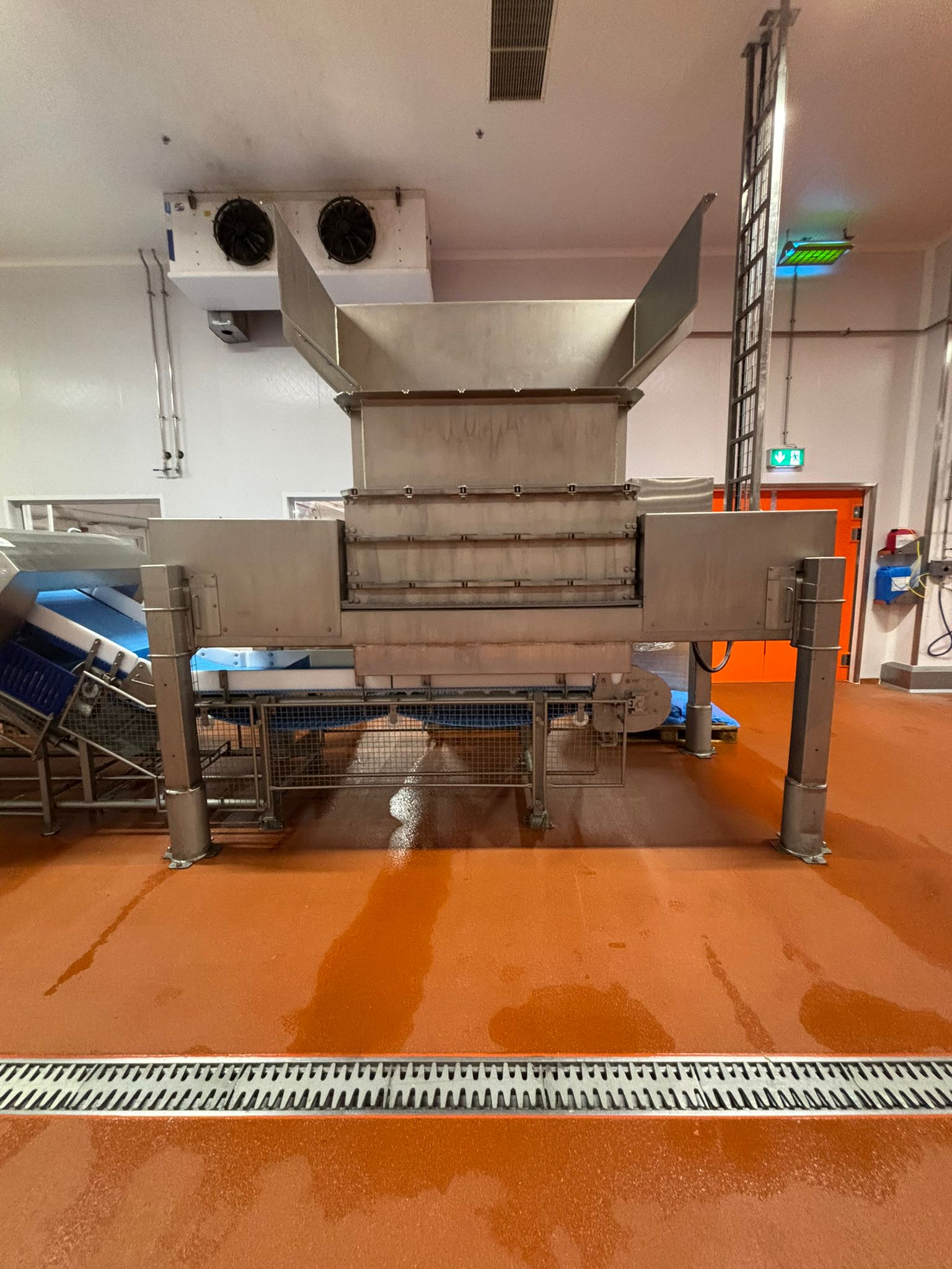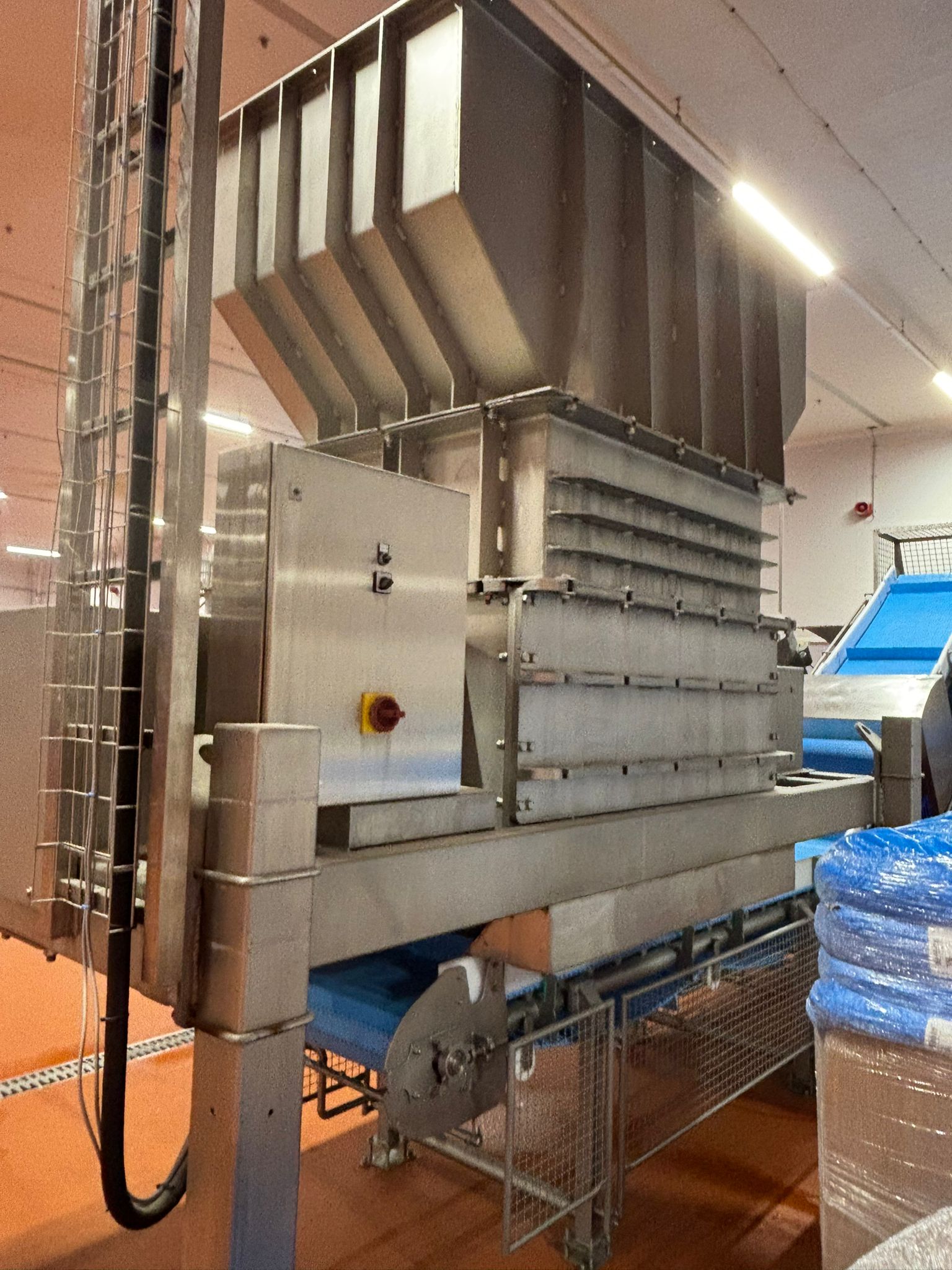 Acier inoxydable complet Largeur de voie 600 mm hauteur réglable du produit fini de 2 à 35 mm Vitesse continue (bande en bas et bande supérieure réglables séparément) avec bande de dévoyage Mobile 0,5 kW Dimensions (L x B x H) : ± 2.250 x 1.000 x 2.100 mm