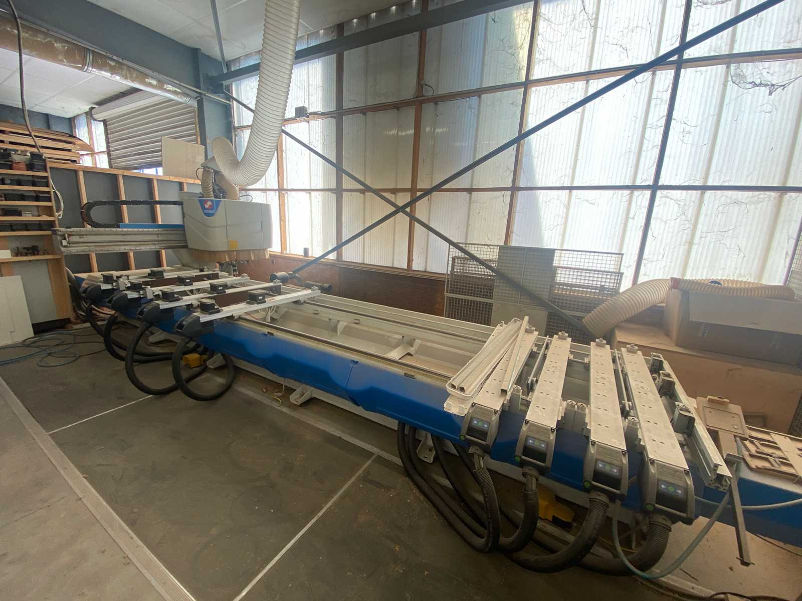 Zone de travail utile : X : 4970 mm Y : 1390 mm Z : 110 mm Configuration : Tête de perçage à 16 mandrins Électro-mandrin 8 kW – ISO30 Variateur de fréquence 8 kW Scie pour incisions longitudinales Groupe de fraisage horizontal à 1 sortie – 2,2 kW Magasin outils 8 positions – bord chariot ISO30 Plaque support d’adaptation pour têtes index Table : Table de travail avec barres et ventouses Table à blocage pneumatique 2 butées par barre 8 × ventouses 114 × 140 mm – H 100 (à confirmer) 8 × ventouses 125 × 75 mm – H 100 longitudinales (à confirmer) 8 × ventouses 120 × 50 mm – H 100 longitudinales (à confirmer) 8 butées avant + 2 latérales supplémentaires Équipement : Pompe à vide 250 m³/h CN sur PC externe (PC inclus) Écran TFT 17\" PC et instructions en français Mastercabinet niveau 1 Alimentation : 400 V – 50 Hz Conformité : Normes de sécurit ...