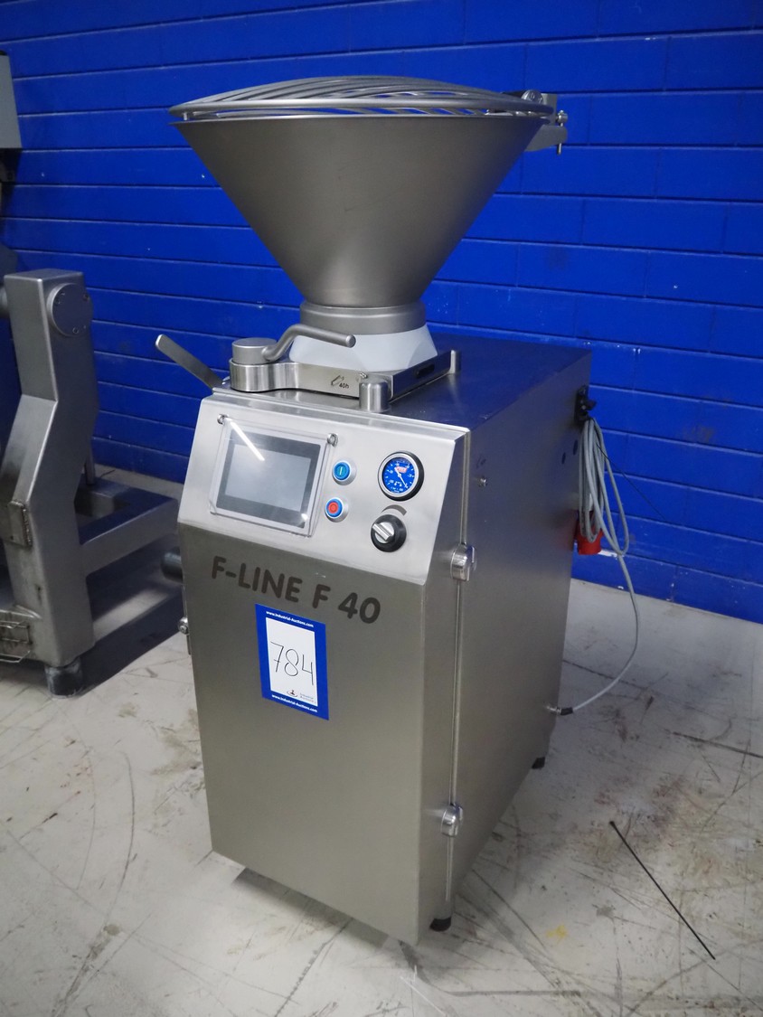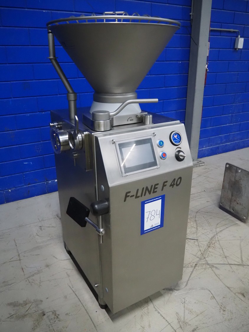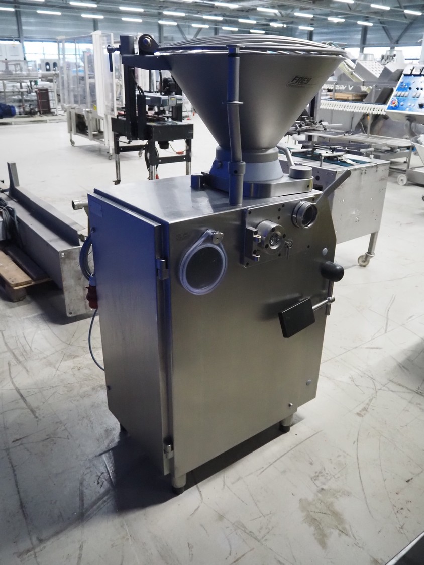 Frey F-Line F50 remplisseur de vide, machine de remplissage sous vide pour le remplissage, portion, éteignement, contrôle CAN, capacité de remplissage jusqu’à 2200 kg/h, remplissage de la pression 30 barre. La machine peut être testée à Koblenz, en Rhénanie-Palatinat.