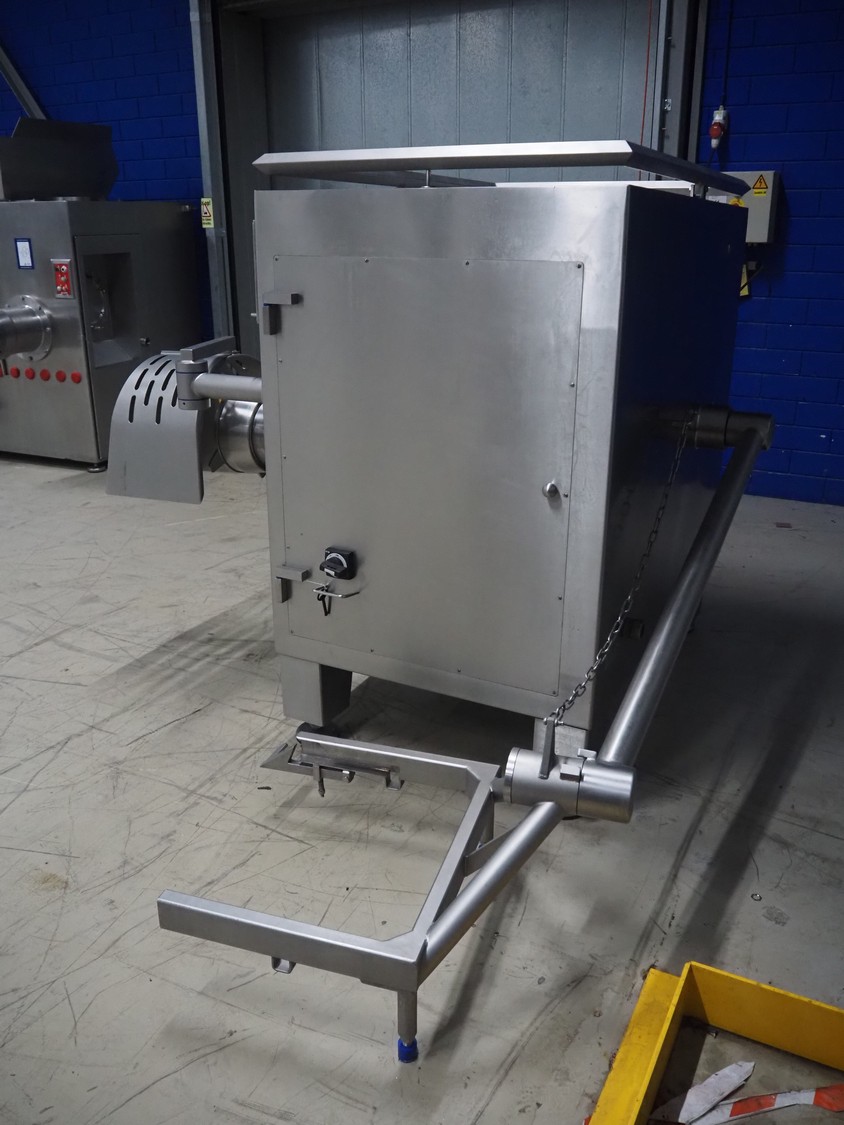 Hachoir Seydelmann avec poussoir pour bacs à viande de 200 litres, type : AU 200 B, numéro de machine : S9-20200-1257-17, année de construction : 2017, 400 V, 50 Hz, 107 A, 57 kW, poids : 1900 kg, plaque de diamètre : 200 mm, dimensions totales : 2700 mm x 2130 mm x 1790 mm.
