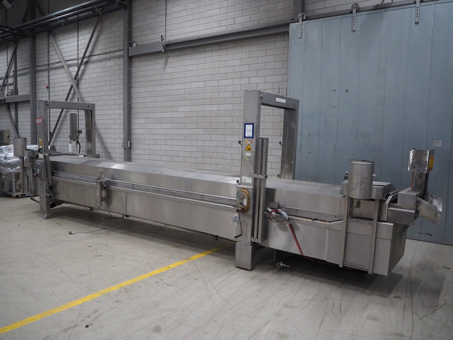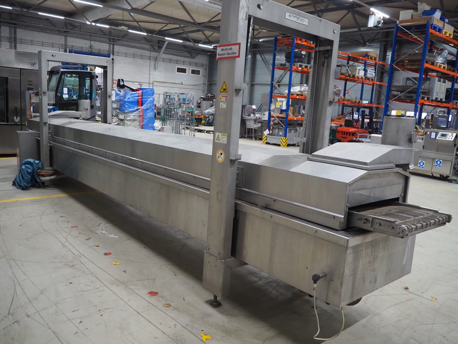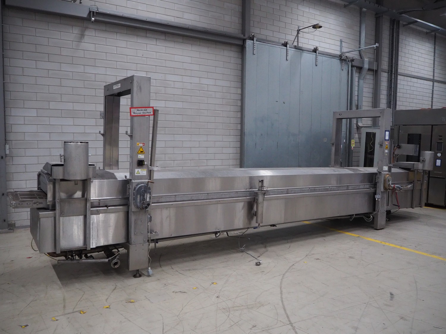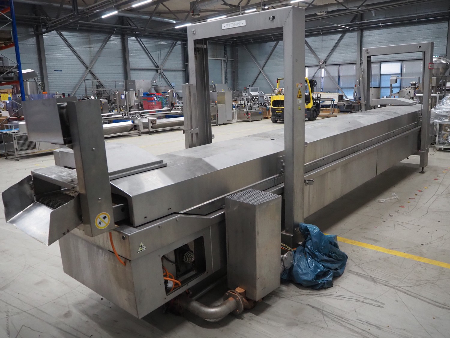 Friteuse à ceinture Stork, type : TBM 630/5000, numéro de série : 4T210506, courroie en maille s/s, largeur de bande : 630 mm, huile thermique, volume : 1200 litres, dimensions totales : 8600 mm x 1700 mm x 2400 mm.
