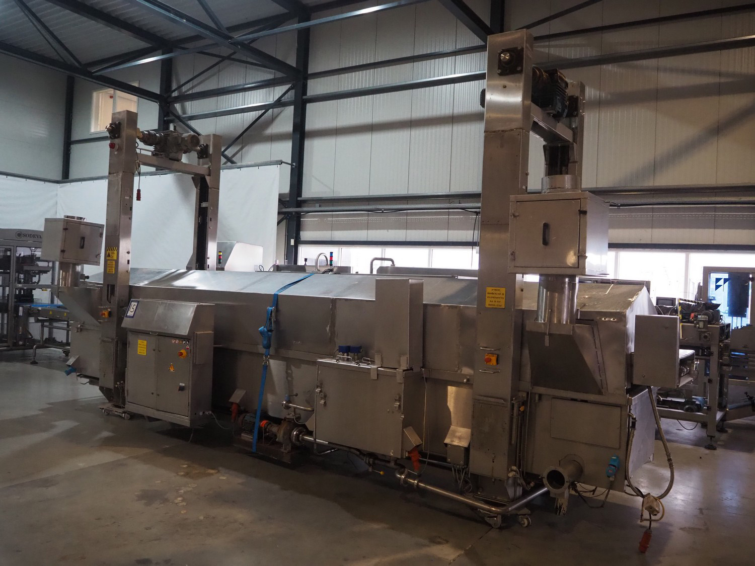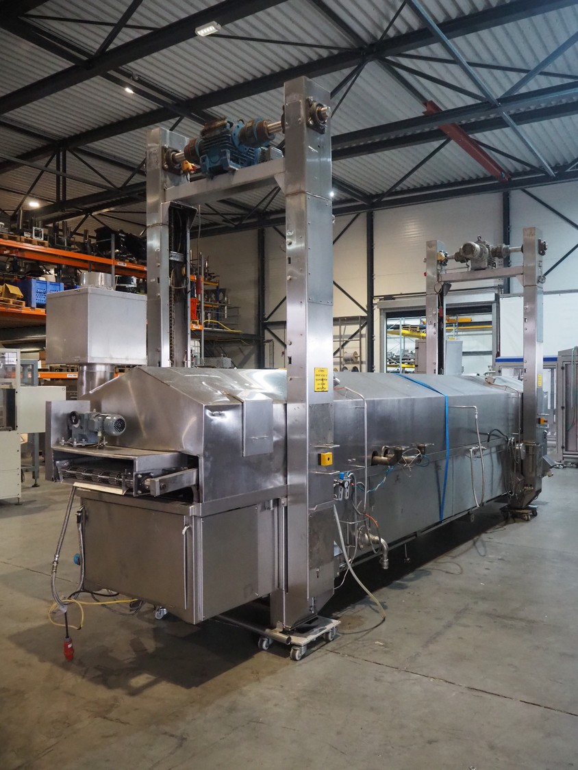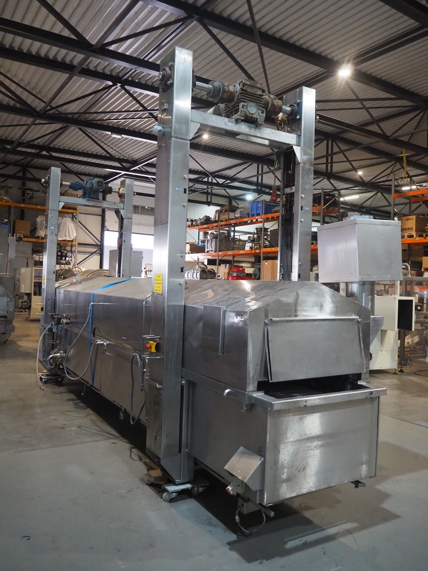Friteuse à bande alimentaire Tetra Laval, type : BRN 4500/700, numéro de machine : BRN4500/700-1046, année de construction : 1995, 415 V, 3 Ph, 50 Hz, 17,87 A, 6,47 kW, poids : 4140 kg, courroie s/s, largeur de bande : 700 mm, dimensions totales : 8300 mm x 2000 mm x 3450 mm. Y compris la cuve à filtre mobile s/s, dimensions : 1300 mm x 750 mm x 500 mm. Les rouleaux de transport non inclus.