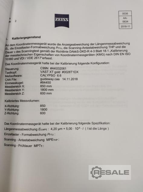 Zeiss MC 850 VAST XT Or Plage de mesure : X= 850 mm, Y= 1800 mm, Z= 600 mm Rénovation complète 2018 Commande C99 avec panneau de commande BP26_SE Sonde VAST XT Gold Chargeur de changement de stylet MSR 13 fois Logiciel Calypso 2018 Basic CNC Option Interface QS-Stat Boule d’étalonnage Autres accessoires de stylet Techniquement et visuellement en excellent état
